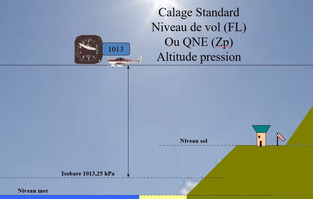Au-dessus du niveau de transition, on utilise le QNE (calage 1013,25). L’altitude affichée avec ce calage peut être éloignée de l’altitude réelle. Ici encore une fois, ce n’est pas un problème dans la mesure ou l’avion vole haut. Le but de ce calage est uniquement de permettre l’espacement vertical des avions entre eux.