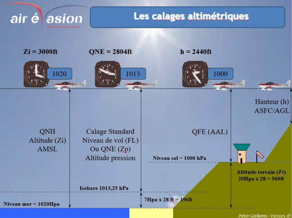 L’altimètre utilisé en aviation est en fait … un baromètre gradué en pieds. Il indique une hauteur au-dessus de la surface isobare affichée, via le bouton de calage, dans la fenêtre de Kollsman.
