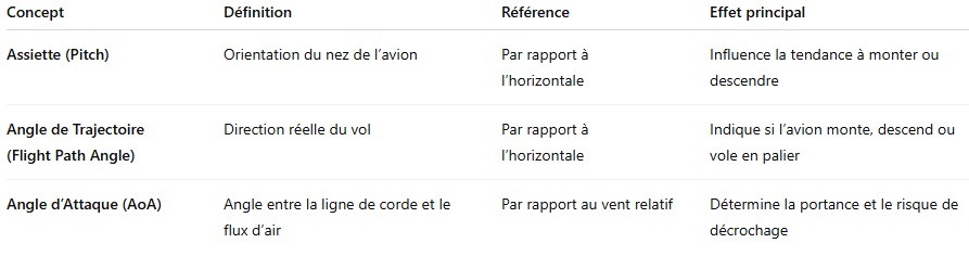 Une assiette élevée n’implique pas toujours une montée, car tout dépend aussi de la vitesse et de la portance générée. C’est ici que l’angle de trajectoire entre en jeu.