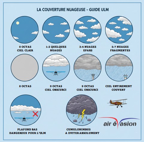 En ULM, vous volez généralement à basse altitude et êtes très sensible aux conditions de vol à vue (VFR). La couverture nuageuse affecte principalement la visibilité et la hauteur de vol.