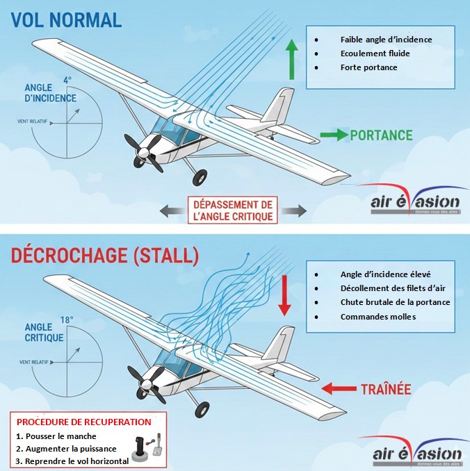 Contrairement à une idée reçue, le décrochage n’est pas lié uniquement à la vitesse, mais à l’angle d’incidence (ou angle d’attaque).