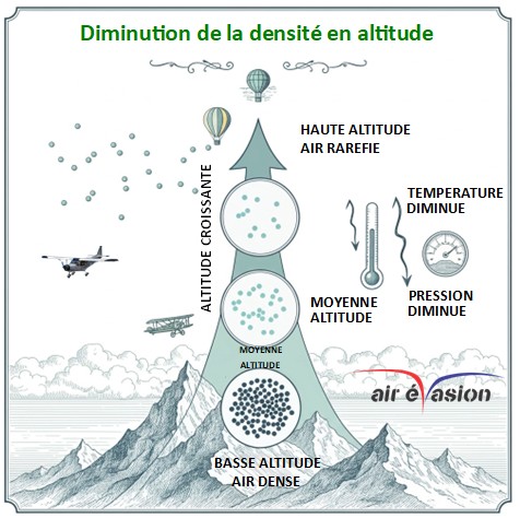 Plus on monte, plus la pression atmosphérique et la température diminuent, ce qui entraîne une baisse de la densité de l’air.